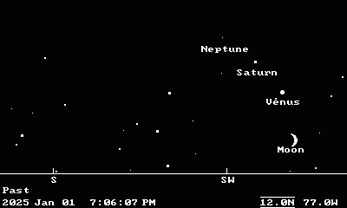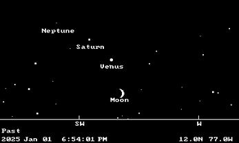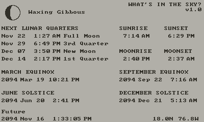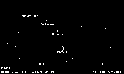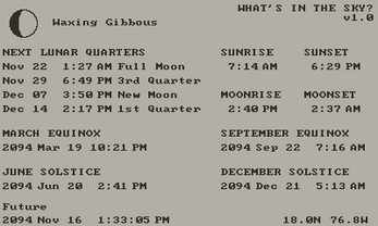 Crank through time to view the night sky as it was, or will be, at any point in the past or future. Set your location with latitude/longitude coordinates. Consult the almanac to see the lunar phase, rise/set for the sun and moon, and more!